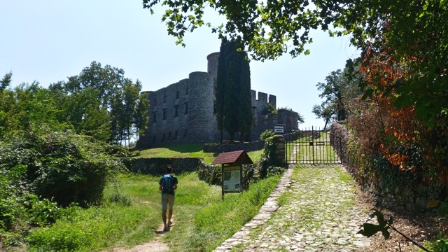 Ci dirigiamo poi verso la prossima tappa, la Rocca Oldofredi-Martinengo, un castello posto su uno sperone roccioso in località Menzino. Percorriamo la strada asfaltata fino a Menzino, e troviamo il cartello “Sentiero didattico della Rocca”. Il castello è privato e si può ammirare solo dall'esterno, passeggiando sul sentiero che lo circonda dove sono stati sistemati cartelli che descrivono le varie specie di alberi presenti. C’è anche una comoda area pic-nic dove ci si può fermare per uno spuntino.